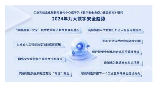在近日海南三亞的《數(shù)字安全免疫力建設(shè)指南》發(fā)布會上,指南分析研判了九大數(shù)字安全趨勢,數(shù)據(jù)要素x安全、AI大模型安全、網(wǎng)絡(luò)安全保險、安全“韌性”、供應(yīng)鏈安全、智能制造、新安全邊界等成為數(shù)字安全未來發(fā)展重點方向。