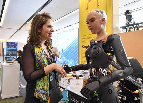 2023年7月7日,在瑞士日內(nèi)瓦“人工智能造福人類全球峰會(huì)”上,一名參會(huì)者與仿真機(jī)器人索菲亞互動(dòng)。(新華社記者連漪攝)