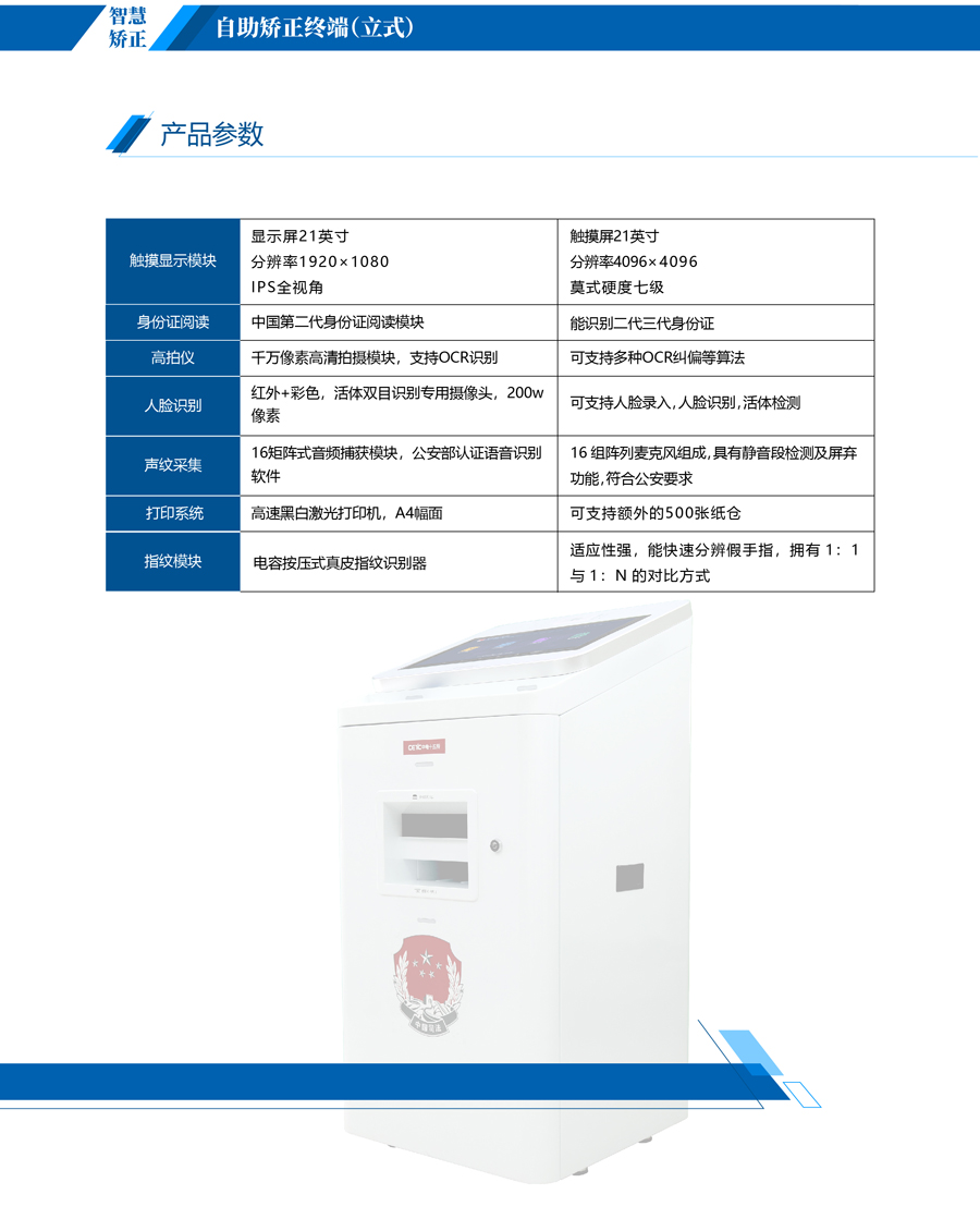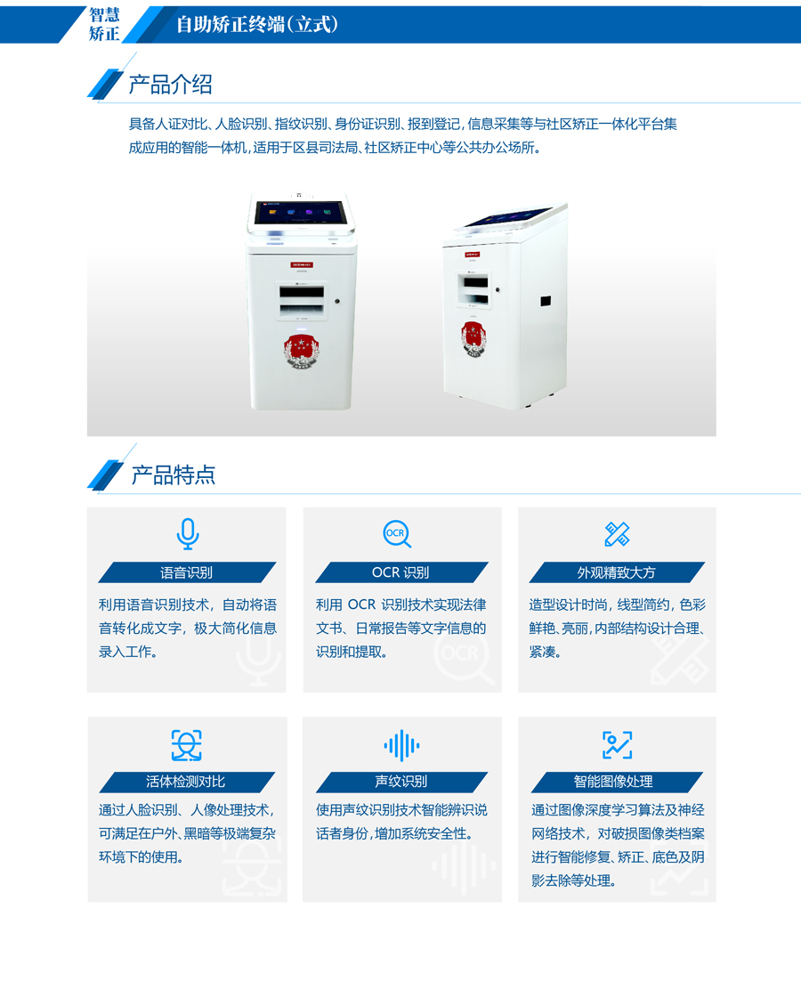 具備人證對比、人臉識別、指紋識別、身份證識別、報到登記、信息采集等與社區矯正一體化平臺集成應用的智能一體機,適用于區縣司法局、社區矯正中心等公共辦公場所。