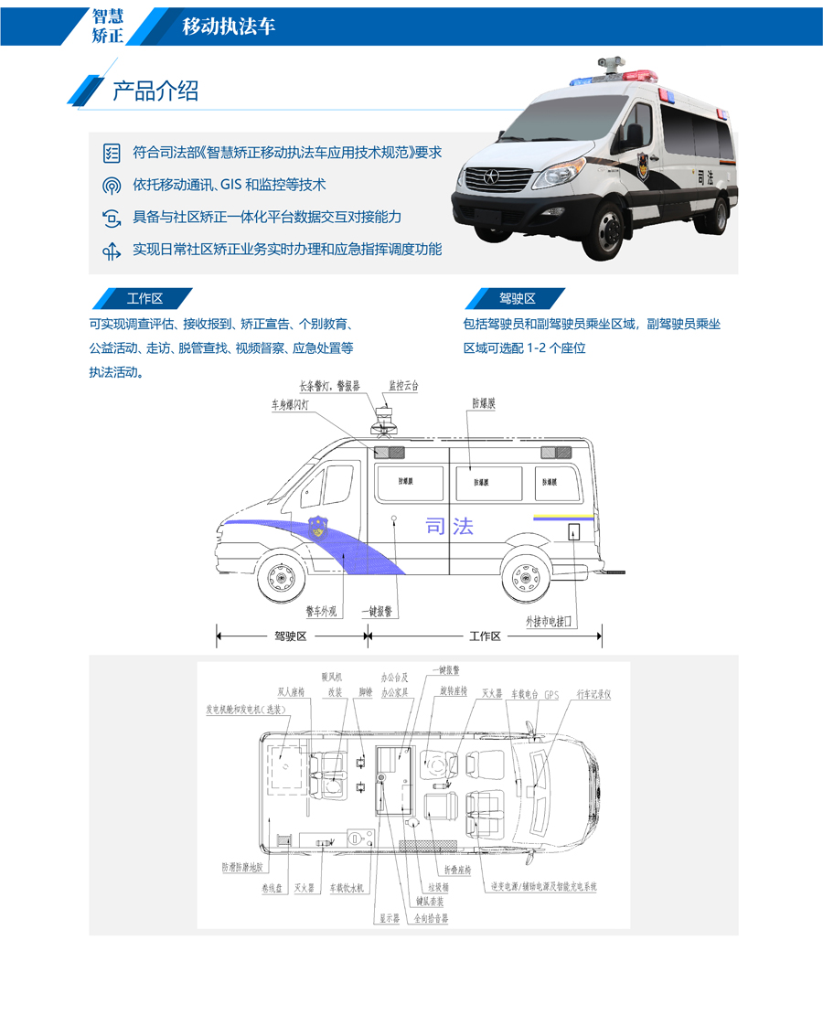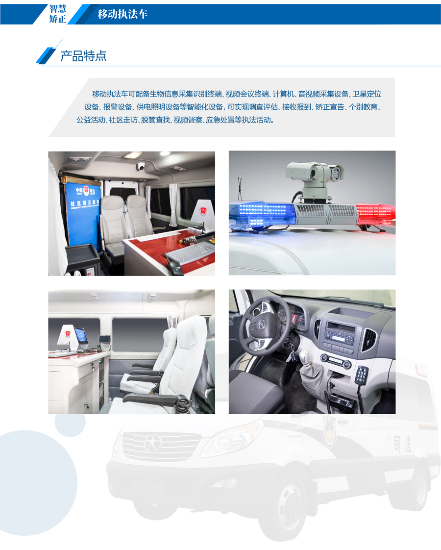 移動執法車可配備生物信息采集識別終端、視頻會議終端、計算機、音視頻采集設備、衛星定位設備、報警設備、供電照明設備等智能化設備,可實現調查評估、接收報到、矯正宣告、個別教育、公益活動、社區走訪、脫管查找、視頻督察、應急處置等執法活動。